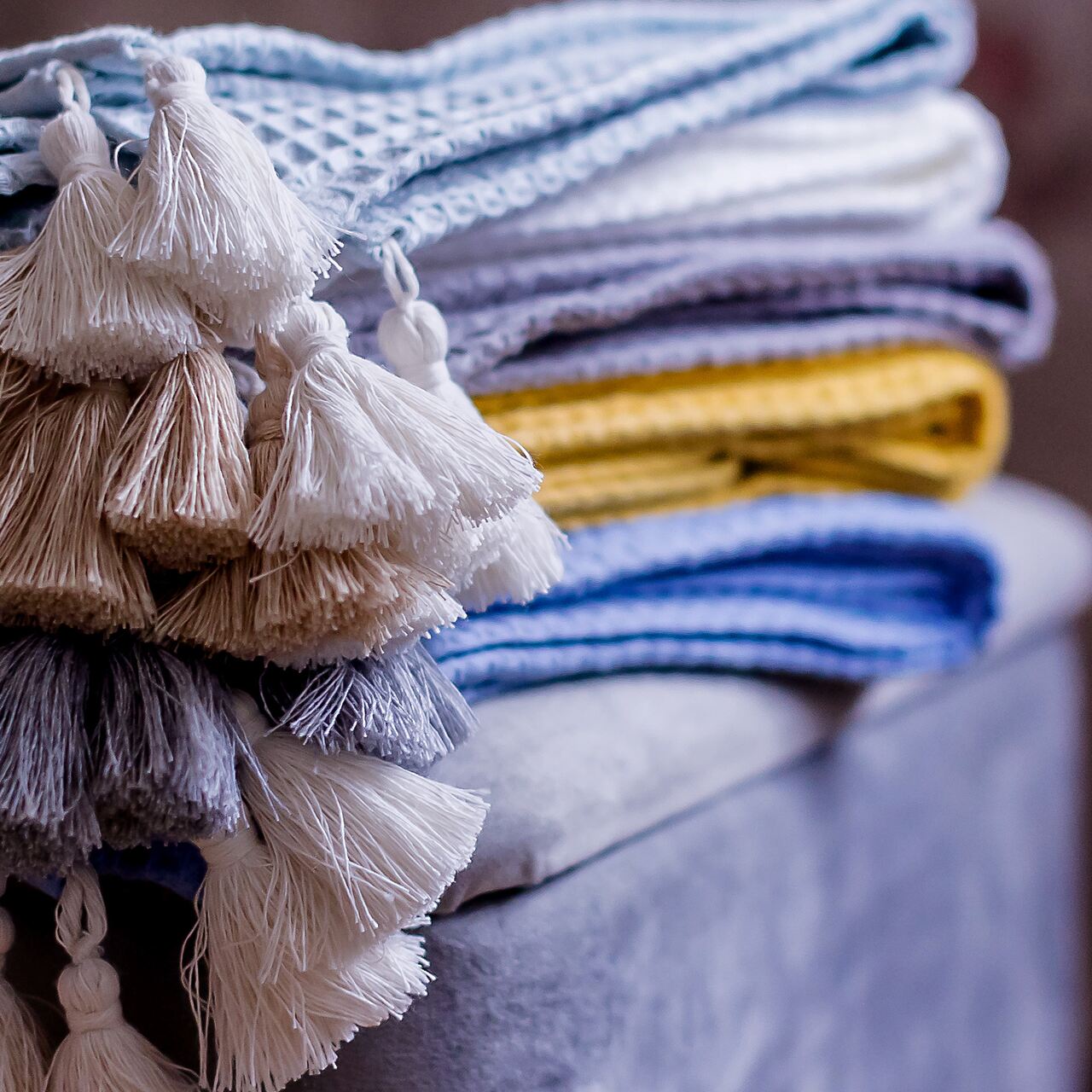 COTTON WAFFLE BLANKET ADORNED WITH HANDMADE TASSELS